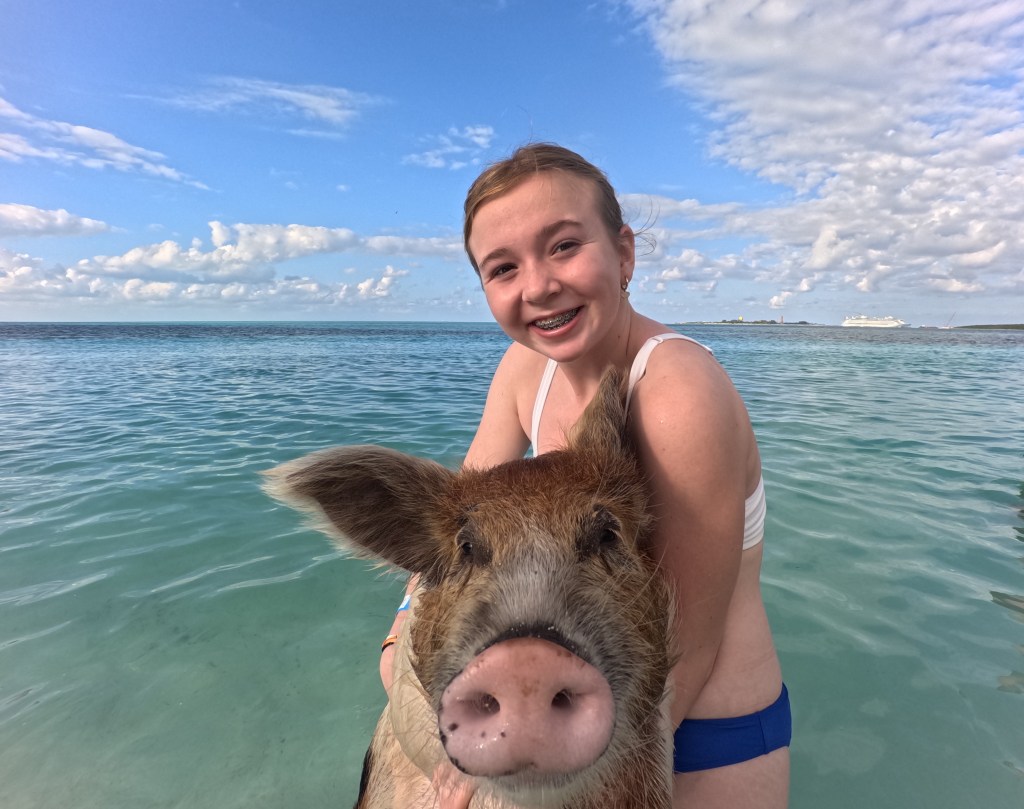 C and I disembarked early to join a tour to a neighboring island to swim with pigs. I have taken C to pet cheetahs, bathe elephants, hold sloths, and swim with stingrays; it felt fitting to add one more unique animal experience to the list. After a quick fifteen-minute motorboat ride, we landed on another cay, where we were introduced to some of the cutest water-loving pigs imaginable. At first, the experience felt more like a swim-with-pigs assembly line—no personal cameras allowed on the beach, lots of handlers, and interactions that felt a bit forced. But back on the deck, things relaxed. Tourists, guides, and pigs alike chilled out, and it turned out to be a lot of fun.
