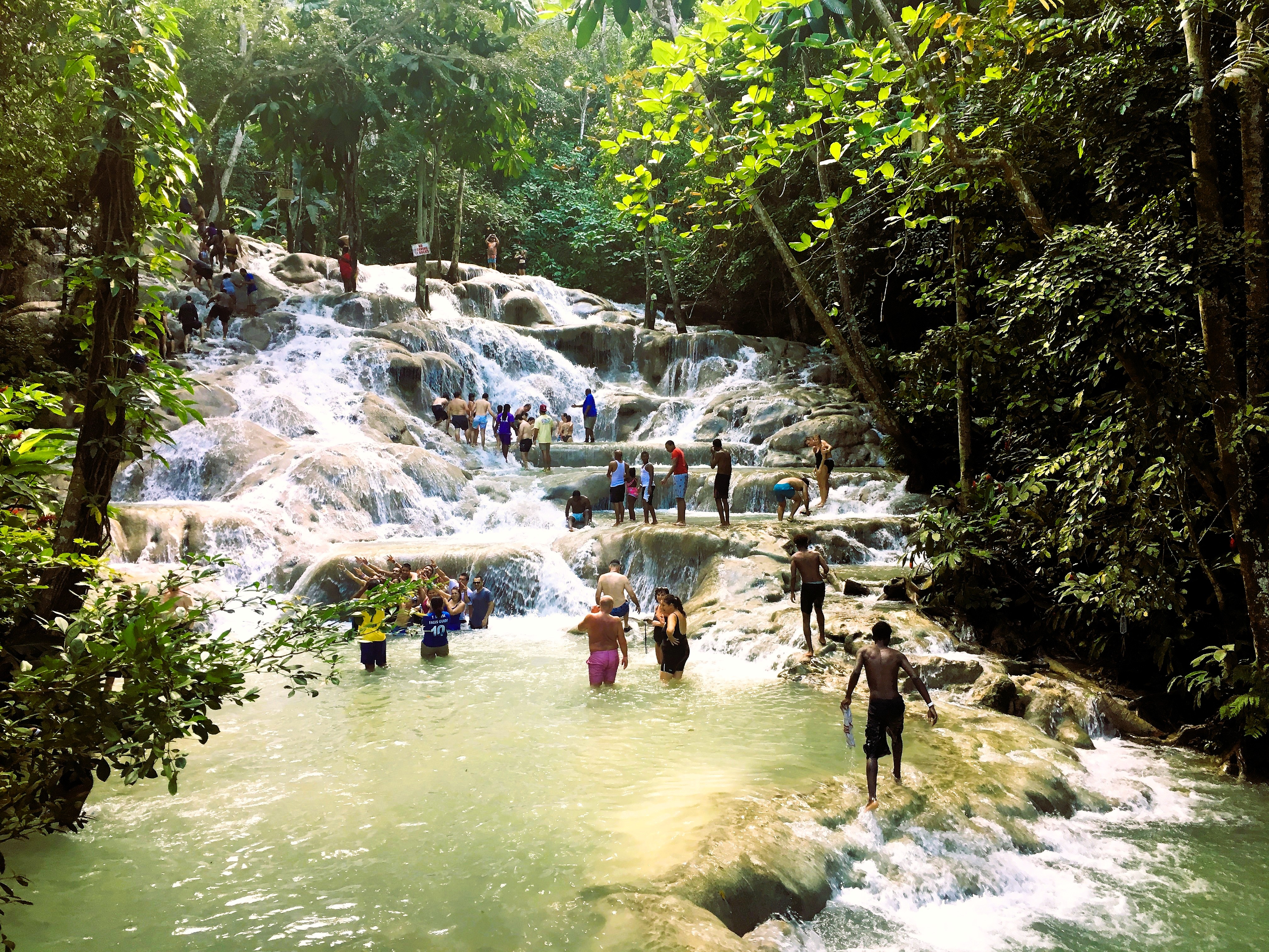 We had booked a seven-hour shore excursion, though, like so many cruise-organized tours, it began with the familiar half hour of staging and instructions in the ship’s theater before we were led off together and loaded onto buses. We were told the drive from Falmouth to Dunn’s River Falls would take about an hour. Everyone was in good spirits—chatting, speculating about the climb, and looking forward to the day ahead—and we didn’t really register the time when we arrived. We were ushered off the bus, funneled through ticketing, and then into the Falls area itself. From there, we were divided again into smaller groups of around fifteen people, each assigned a guide who would lead us through the maze of slippery rocks and fast-moving water, up the tiered terraces of the Falls.