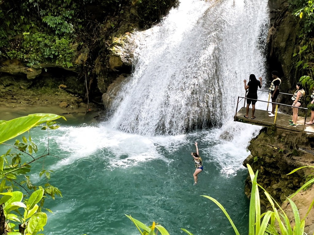 The Blue Hole is a beautiful place: a natural limestone river sinkhole filled with aquamarine water, framed by lush greenery and fed by a series of small falls. It’s the kind of spot meant for swimming, rope swings over deep pools, cliff jumps, or simply standing still and taking it all in. Once again, we were herded off the buses and grouped together, only to wait for our guides. Having cooled off in the air-conditioning on the drive, CZ and I didn’t want to get back into the water, but we had no opportunity to say so. Instead, we were swept along with everyone else, driven like cattle toward the falls, without explanation.