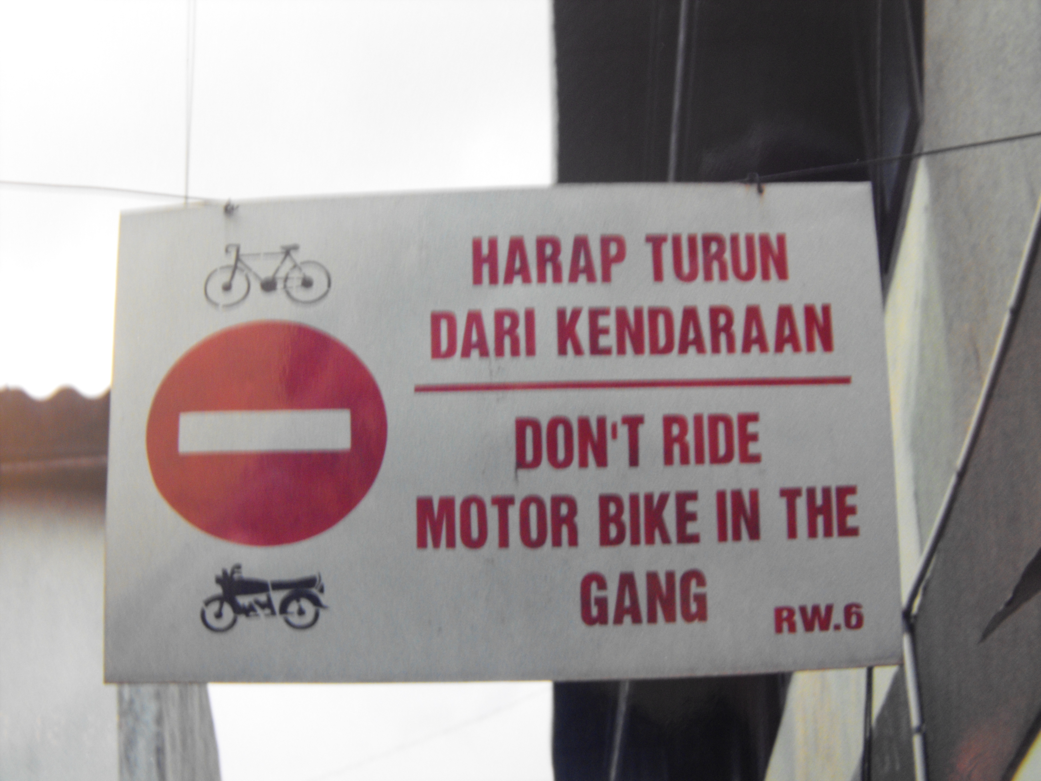 Yogyakarta street signs offer life advice (a “gang” is a small side street in bahasa)