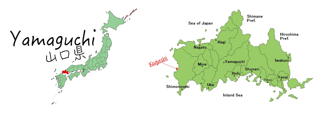 Kogushi, is a farming and fishing town of approximately 5,000, that along with four other similar sized towns, hugs an indented portion of coastline located in Yamaguchi prefecture, the western most part of Japan’s main island of Honshu. Kogushi in Japanese is written 小串 or “ko” meaning “little” and “gushi” meaning “skewer” or “spit” like a kabob skewer – you can see the character itself is a stick with two pieces of meat represented by squares. Frankly, I loved this and came to refer to it as “Little Stick.”