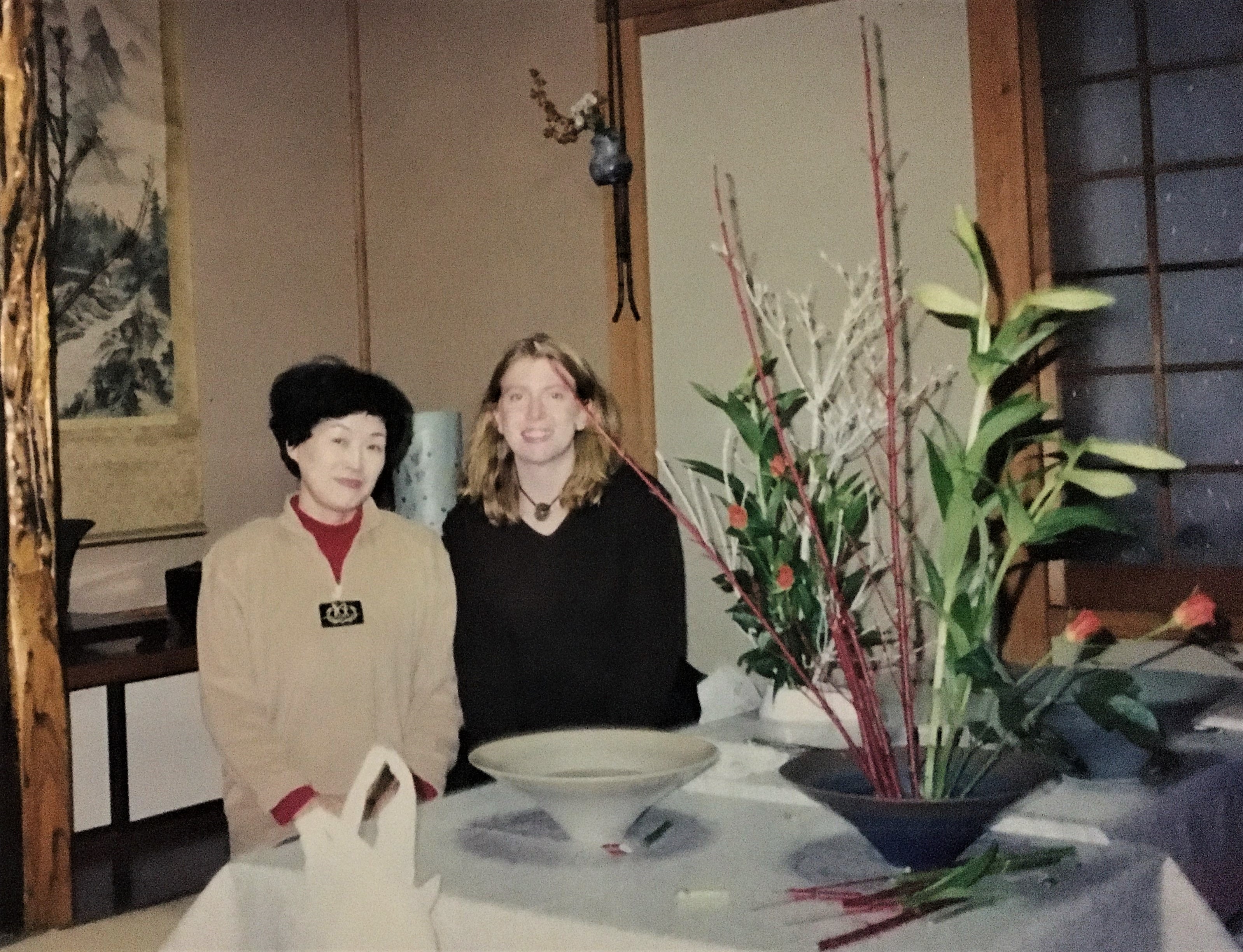 I had somehow met a young English-speaking woman named Kaori who invited me to join her in studying the Japanese art of flower arranging or ikebana. Ikebana is one of the three classical Japanese arts of refinement, along with kodo for incense appreciation and chado for the tea ceremony. This then was something really Japanese to learn that I hoped would be a little more straightforward, a little less ceremonial than the tea ceremony. So, once a week for a little more than a year, Kaori picked me up to head to the home of her ikebana teacher for an hour-long class. We sat seiza style, with our knees folded under us and buttocks on our feet (for as long as I could stand it anyway though I did try to power through) on a tatami mat in front of a low table called a chabudai on which lay an array of carefully curated flowers, blossoms, branches, and other greenery and the all important pruning shears. We also had a kenzen, a weighted metal circle or square with pins to hold the stems of each item into place, and a container or vase. I bought my own.