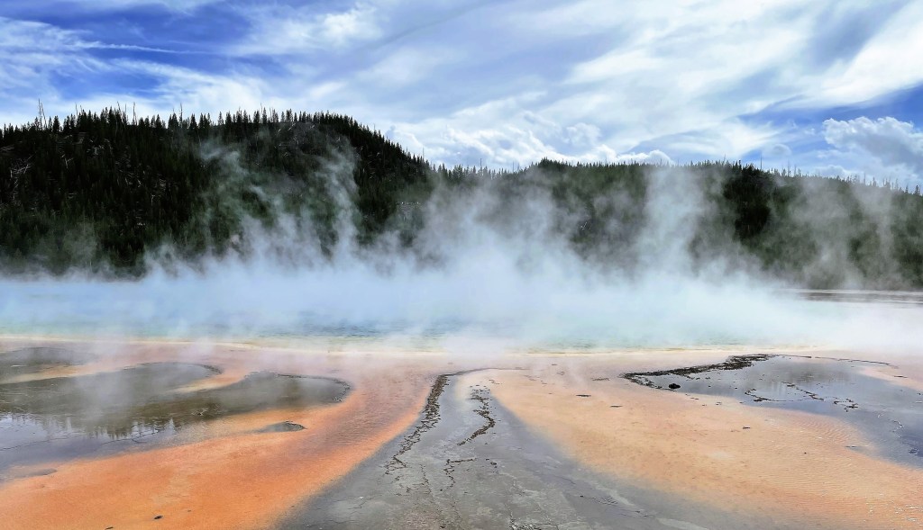 We made it back in time to enjoy a nice lunch at the Canyon Fountain & Grill, a 50s style soda fountain eatery inside the Canyon Village shop. It was one of the few places in the park open for lunch so we took advantage that day. After lunch my aunt had a quiet afternoon at the lodge while C and returned to the Old Faithful area to meander around the trails to see other geothermal features and took another shot at visiting the Grand Prismatic Spring – with success this time. However, we discovered after approaching the spring that it did not in fact lead to the overlook where I had wanted to be. We had already walked for miles that day (with us tracking about 25,000 steps) and we didn’t have the energy for a two hour round trip to the overlook. So that too will need to be earmarked for a future trip.