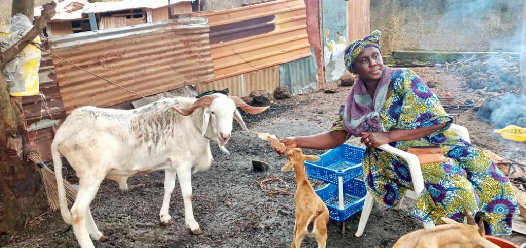 Our nanny AD sitting with goats her family will donate to the needy for Tabaski