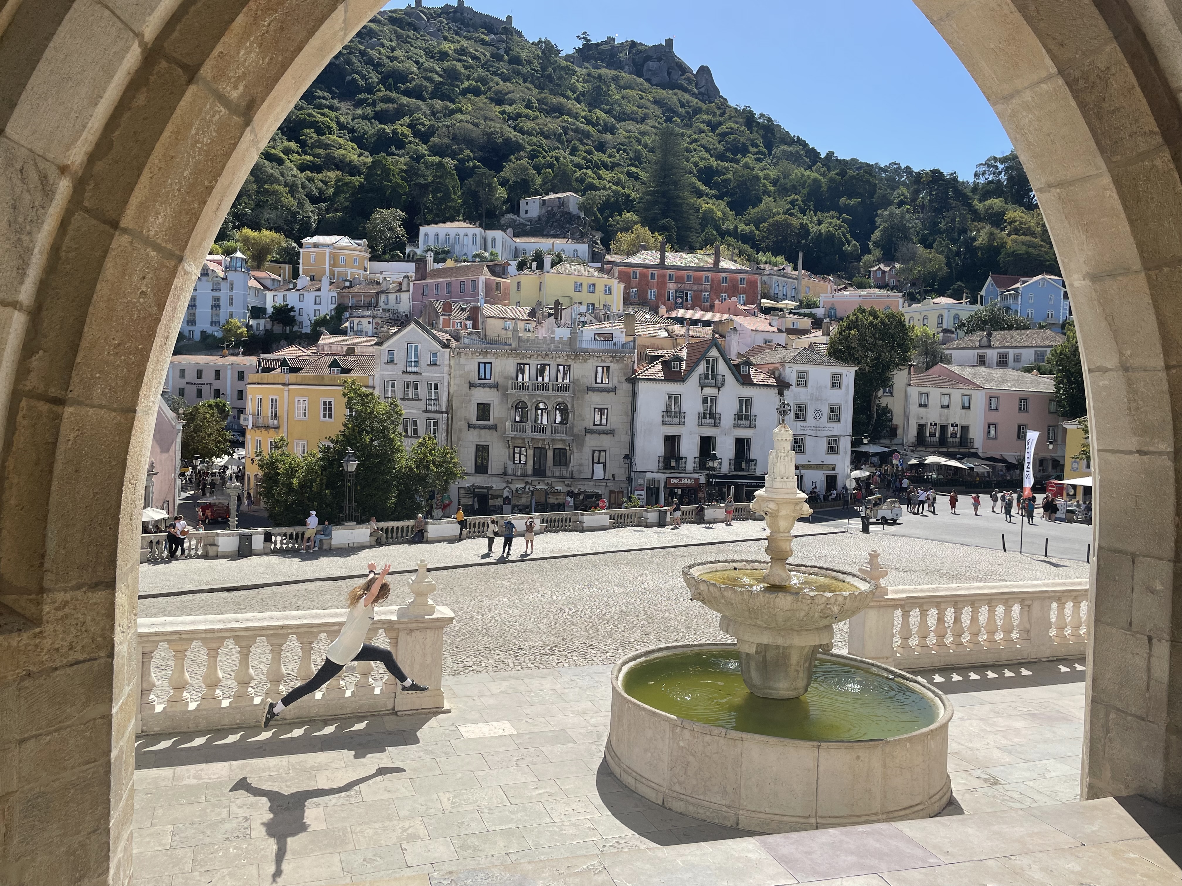 C leaps for joy in front of the Sintra National Palace with the Castle of the Moors overlooking the historic town