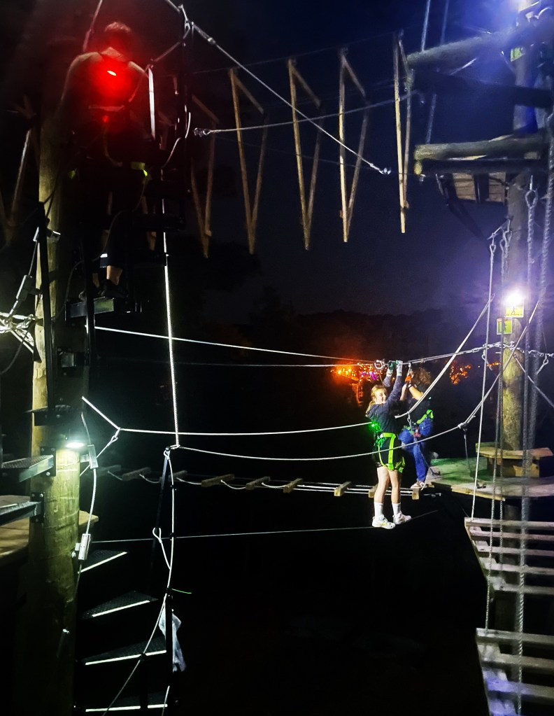 Thus, C tried to chicken out of our evening adventure at Go Ape. We had signed up for the Fright Night activity. I did not know quite what to expect having not been to any of the Go Ape locations ever, but I thought it would be ziplining in the dark and perhaps there would be people dressed up to make it a bit scary. Instead, it was a two-level ropes obstacle course, with the lower level about fifteen feet above the ground and the second level probably 30 feet. The entire time one is attached to a safety line, but it does not feel as if one is (at least not to me). When guests asked “what happens if I fall?” the staff would respond, “you don’t fall, you just dangle.” C caught on very quickly and completed all the obstacles on both levels. She even purposely dangled several times. I could only complete the first level; though I climbed up to the second level, I stood paralyzed at what looked like the easiest of my scary choices for a good five minutes before heading back down.