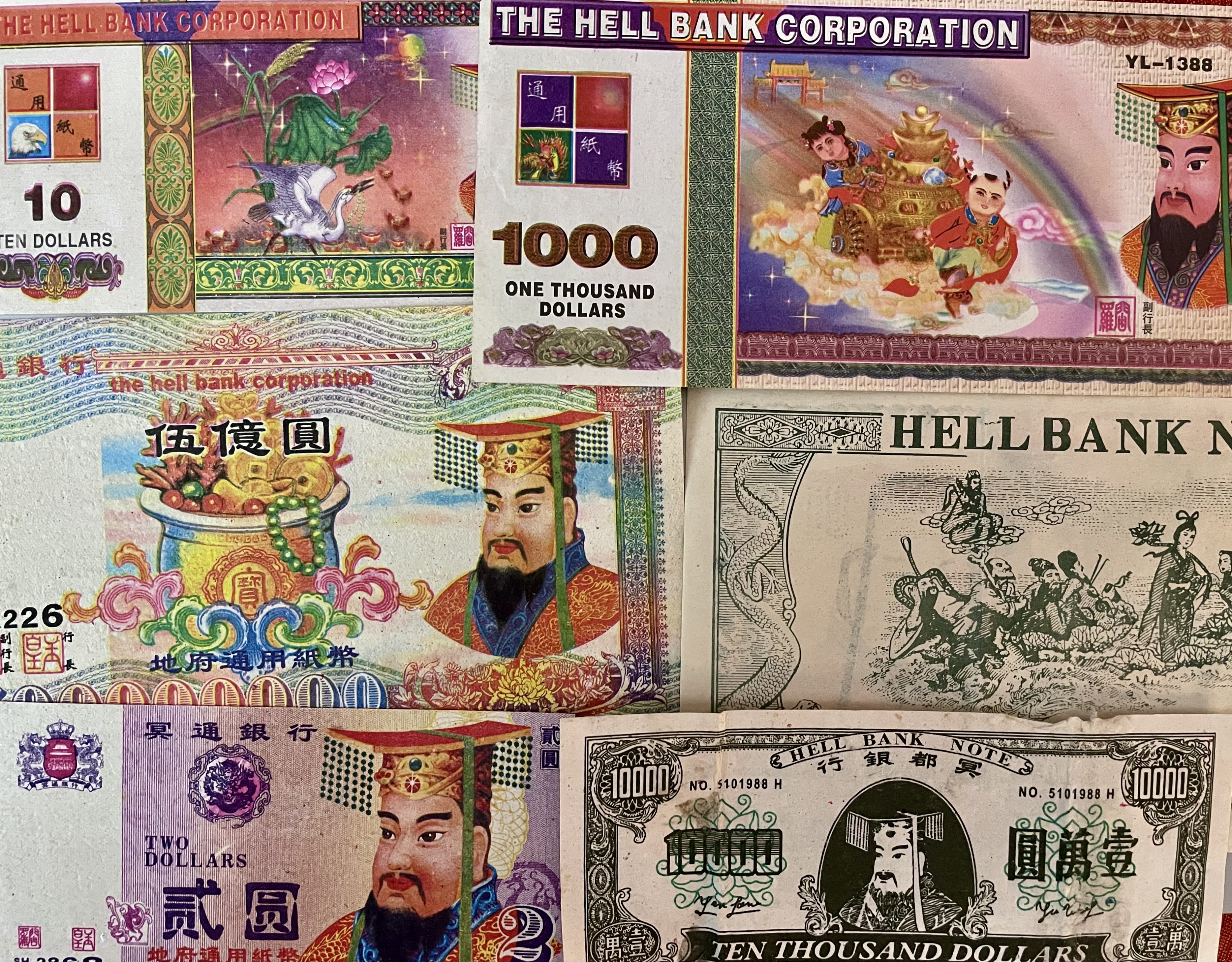 While window shopping, I found a large stock of “hell money,” incense paper resembling various currencies, used in Chinese ancestral worship. By burning the currencies, people transfer funds from the living world to their deceased family members in the spirit world to ensure they will have sufficient funds in the afterlife to buy necessities and luxuries, pay bribes, or atone for their sins. Most hell money notes are high denominations. As a long-time currency collector, I had to buy some to add some to my collection.