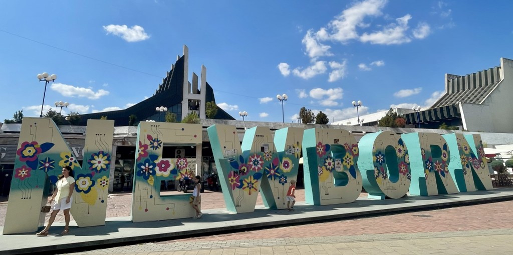 We checked into our hotel in central Pristina. I had originally booked our final two nights near the airport but changed plans so we could spend a day exploring the city more easily. Once we settled into our room, we headed out for lunch nearby and then began a self-guided walking tour. Our first stop was the Newborn Monument, a large block-letter sculpture that celebrates Kosovo’s declaration of independence from Serbia on February 17, 2008. The monument changes its colors and design each year on that date, symbolizing the country’s evolving identity. Across the street, we visited the Heroines Monument, which depicts an Albanian woman formed from 20,145 metal pins — each representing the contributions and sacrifices of Albanian women during the 1989-1999 Kosovo War. The Newborn Monument felt celebratory and hopeful, while the Heroines Monument carried a quieter, somber weight. Facing one another, the two together formed a powerful message about the devastation of war and the hope that follows in its wake.