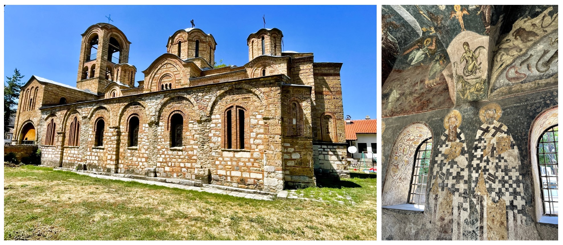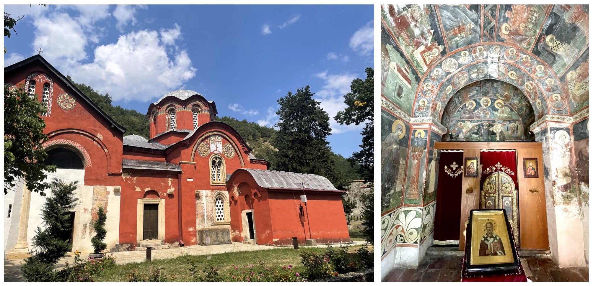 On our last day, we packed up the car for one final sightseeing drive, heading to the town of Gračanica, just five miles from Pristina. Our goal was the 14th-century Serbian Orthodox Gračanica Monastery — the fourth and final of the UNESCO-designated Medieval Monuments in Kosovo that we would visit. Like the others, the monastery centers on a stand-alone church within a walled complex, its interior lined with offices and living quarters. Inside, the church walls are covered with magnificent frescoes depicting scenes from the Bible — vivid, detailed, and deeply expressive. It was beautiful, though also the busiest of the four UNESCO sites we’d seen, and the strictest about what visitors could and could not do.