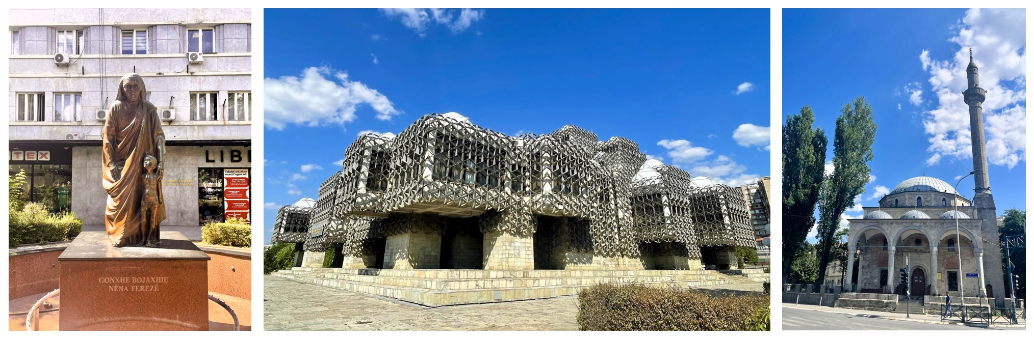 From there, we continued our walk along Mother Teresa Boulevard, a broad, pedestrian-only avenue lined with shops, cafés, and people out enjoying the day. We passed a statue of Mother Teresa herself — an important figure in Kosovo, as she was ethnic Albanian and is said to have found her spiritual calling in the small village of Letnica, in southern Kosovo. We followed the boulevard until we reached the Kosovo Parliament building, then crossed the street to the Çarshi Mosque. Built in 1389 to commemorate the Ottoman victory in the Battle of Kosovo, it is the oldest surviving building in Pristina. Behind it stands the National Museum of Kosovo, housed in an Austro-Hungarian building from 1889, though unfortunately it was closed for renovation during our visit.