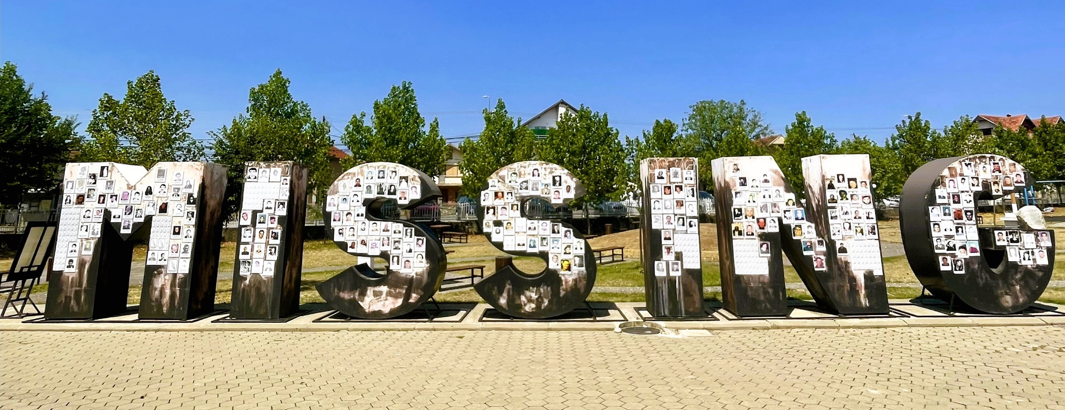 Outside the monastery, we took a short walk around town. One of the first things we noticed — or rather, C did, with her knack for recognizing flags — was the presence of Serbian flags and the use of the Serbian language. It was a noticeable change from what we had seen elsewhere: in Prizren and Peja, Albanian flags and symbols were everywhere, while in Pristina, we had seen a modest number of Kosovar flags. Here, the Serbian presence was unmistakable. A statue of the legendary Serbian knight Miloš Obilić stands prominently in the town center, and nearby is the Missing Monument, a somber memorial honoring the Serbs who were kidnapped or went missing during and after the Kosovo War.