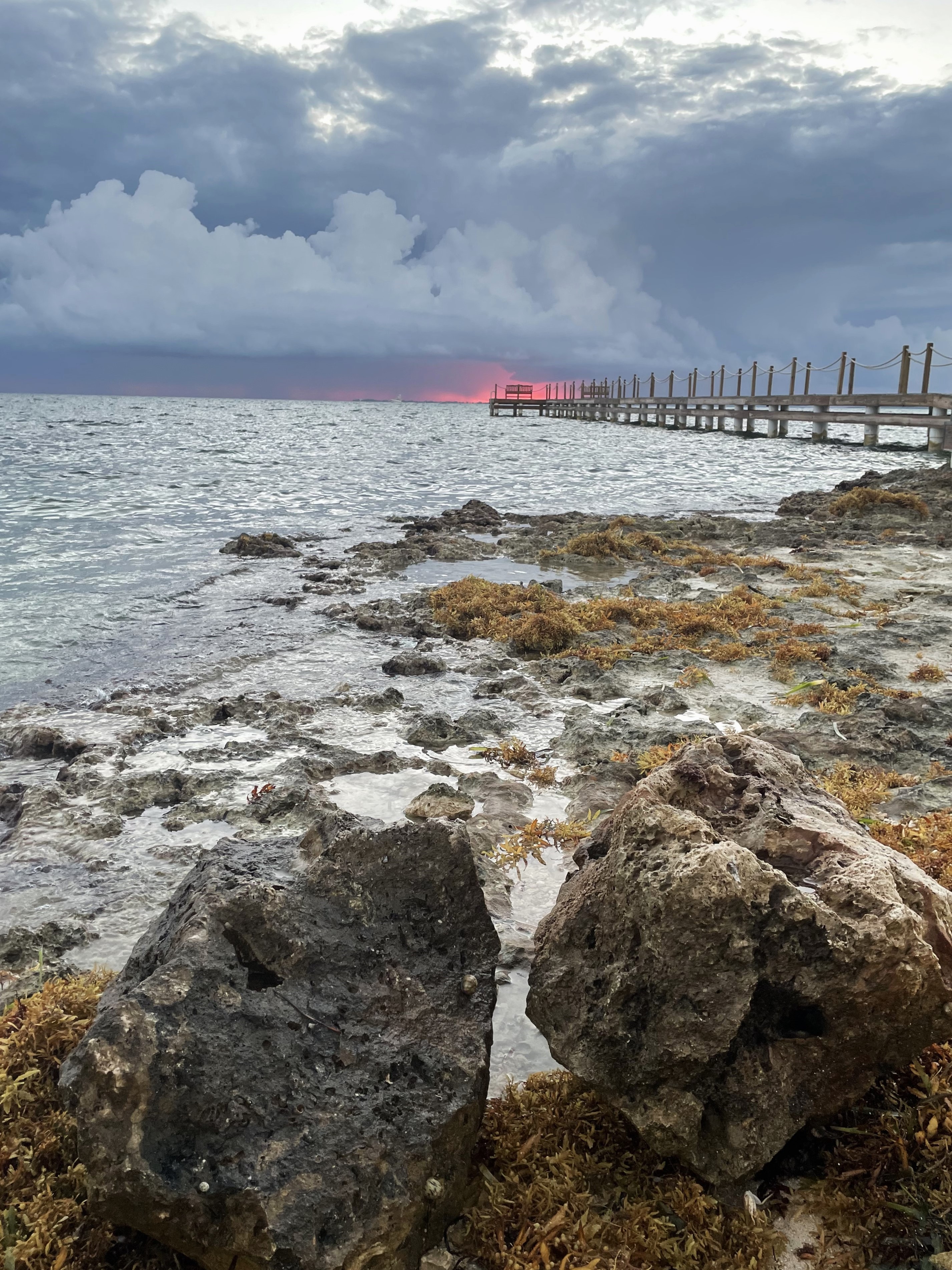 On Friday, our sixth day, the weather had turned. It was still very warm of course, but it had grown cloudy and windy. I was glad we had joined the Stingray City tour early in the week as the wind made the sea a bit choppier. I woke up early to catch the sunrise and walked out to the hotel’s little beach. It did not look promising with all the clouds, but just when it looked like there would be no sunrise at all, a ball of red light began to glow at the base of the clouds. With the cloud cover, the light did not have much room to grow, but though small, it was dramatic.